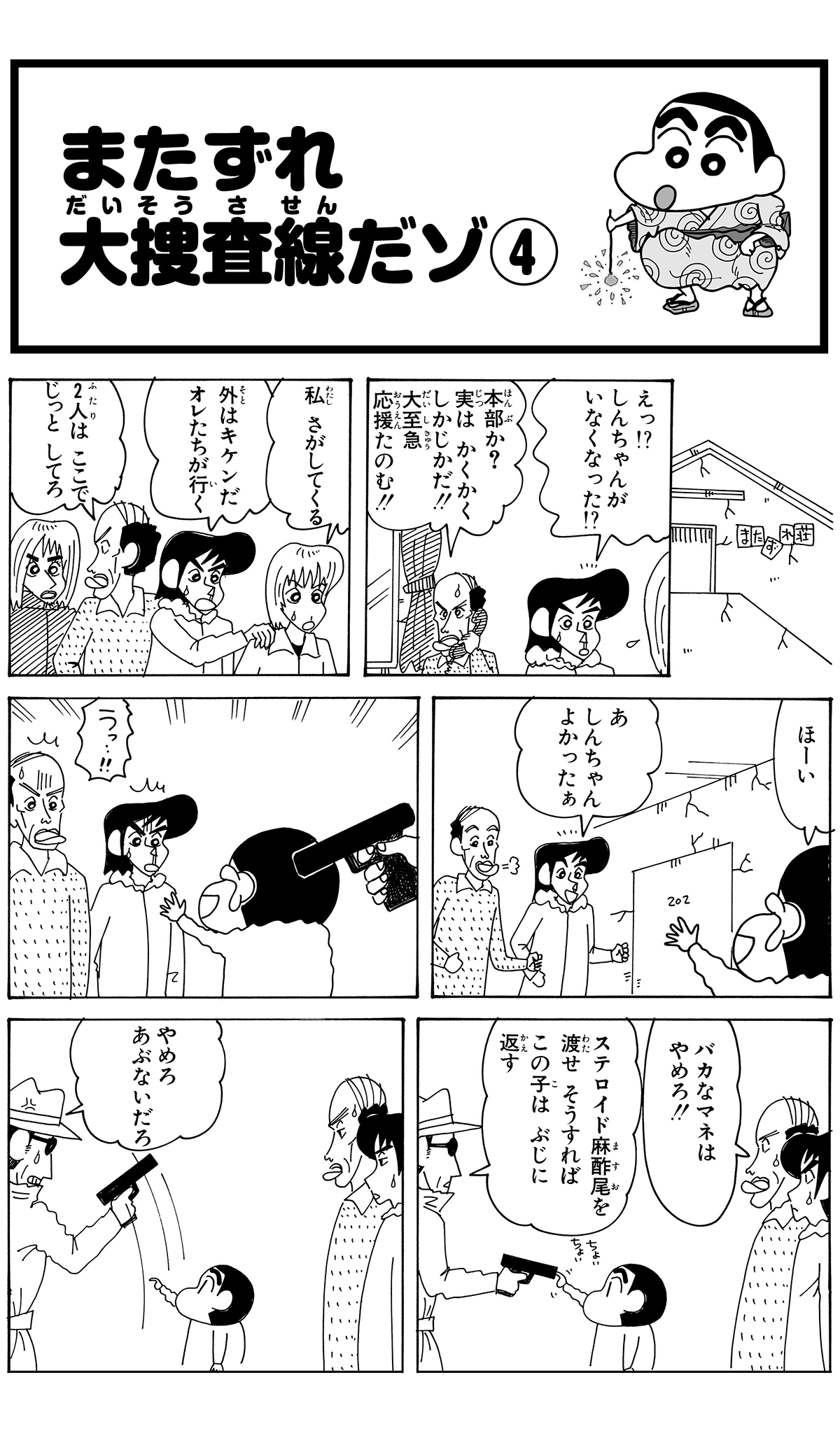 全7話公開中! 546 またずれ大捜査線だゾ その4 2026.3.2 臼井儀人 ポスト LINEで送る ■ジュニア版クレヨンしんちゃん オリジナルのコミック『クレヨンしんちゃん』全50巻の中から、お子さまにも読みやすいお話をセレクトした再編版! 本記事は「ジュニア版 クレヨンしんちゃん 19」から一部抜粋・編集しました。 野原一家 しんちゃん ひろし みさえ ひまわり またずれ荘 四郎 大屋 主代 スーザン小雪 行田 徳郎 にがりや京助 ■ジュニア版クレヨンしんちゃん ■【画像】見つけたゾ!怒鳴るかざまくん■ ジュニア版クレヨンしんちゃんまたずれ大捜査線だゾ その4 このお話の単行本を購入 電子コミックストアで購入 原作: 臼井儀人 87年に『だらくやストア物語』が双葉社「週刊漫画アクション」新人賞佳作に入賞しデビュー。90年8月より『クレヨンしんちゃん』を同誌にて連載開始。その他の代表作は『おーえるグミ』『あんBaらんすぞ~ん』『すくらんぶるえっぐ』など。 「ひろし」の商品を見る