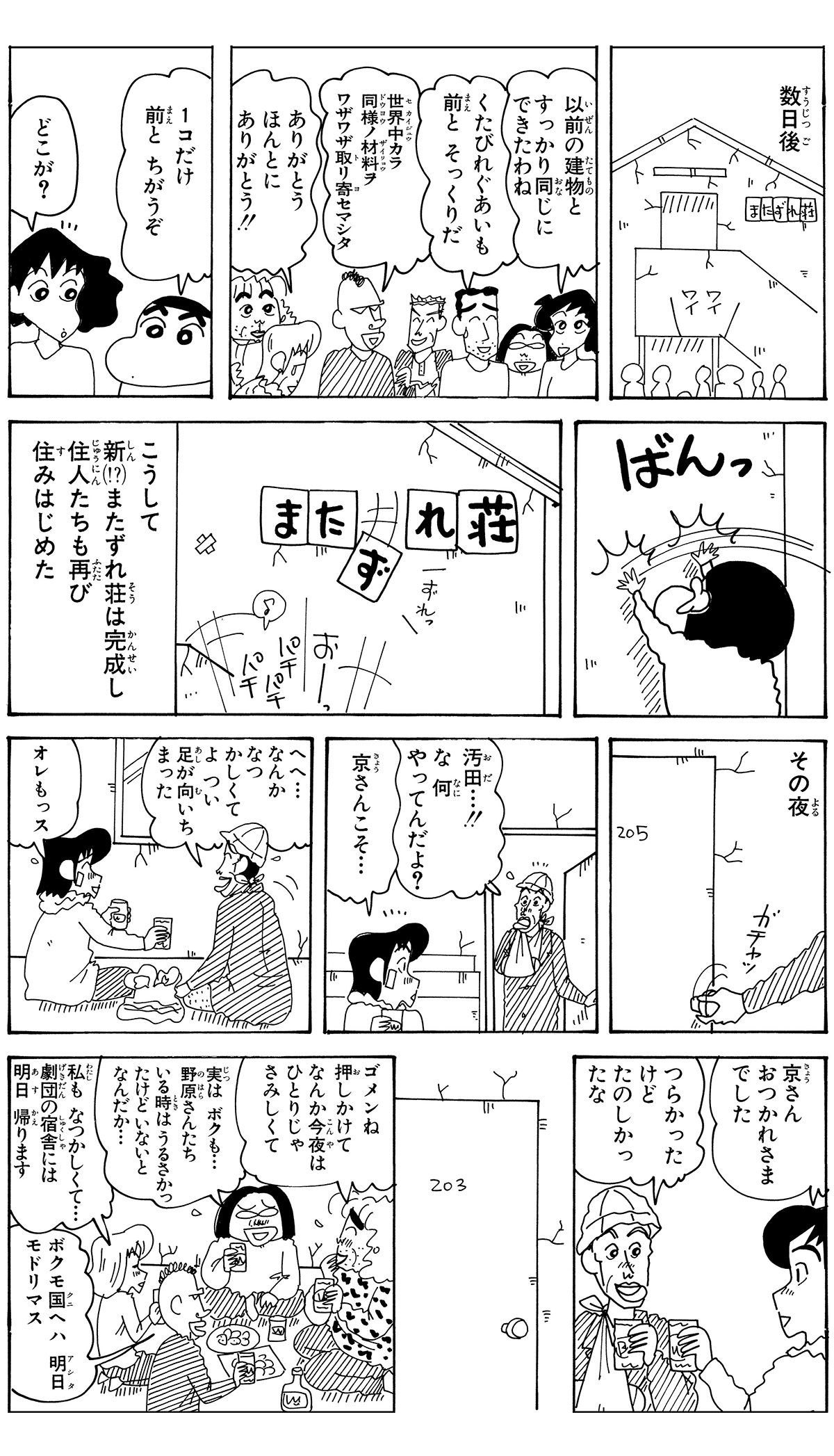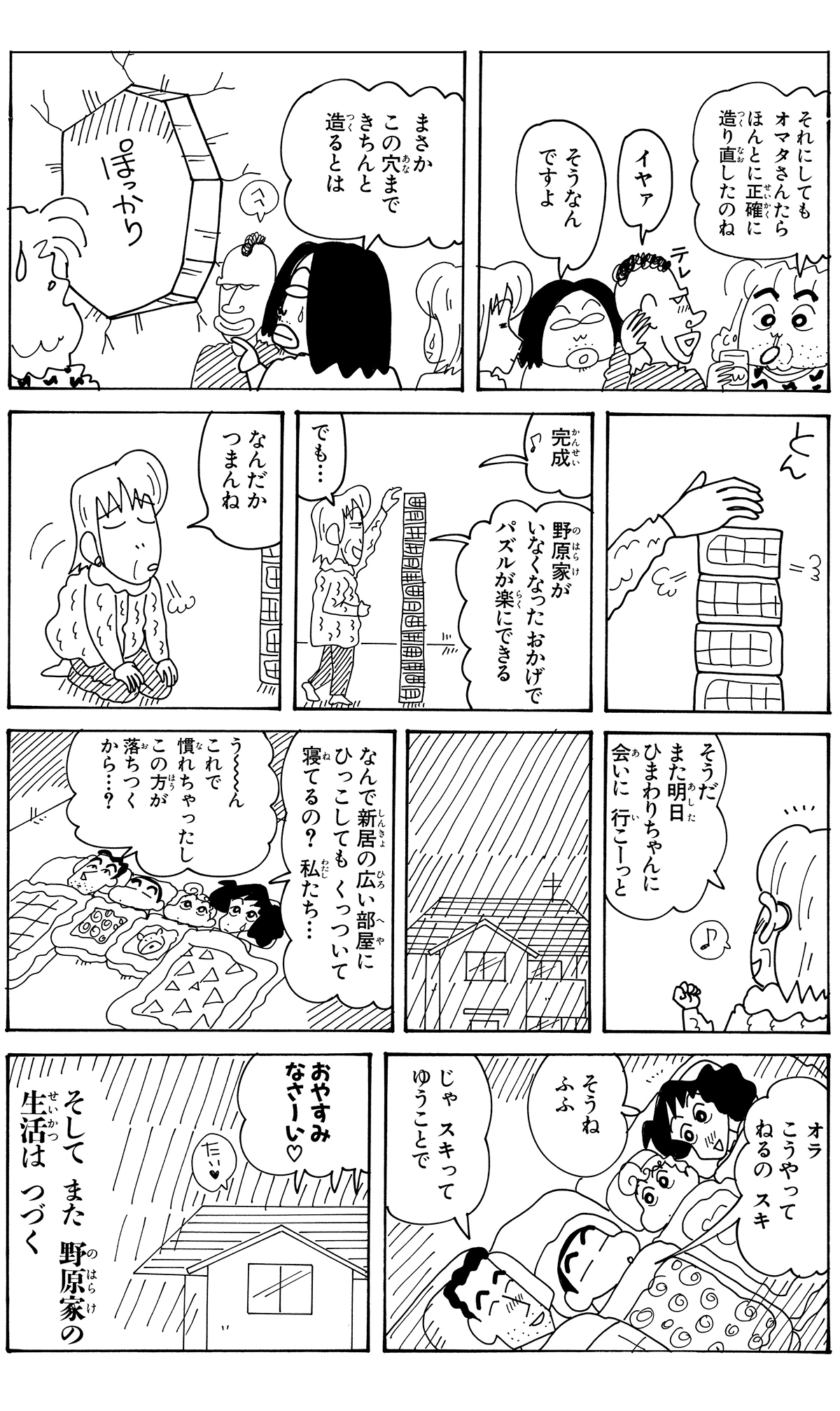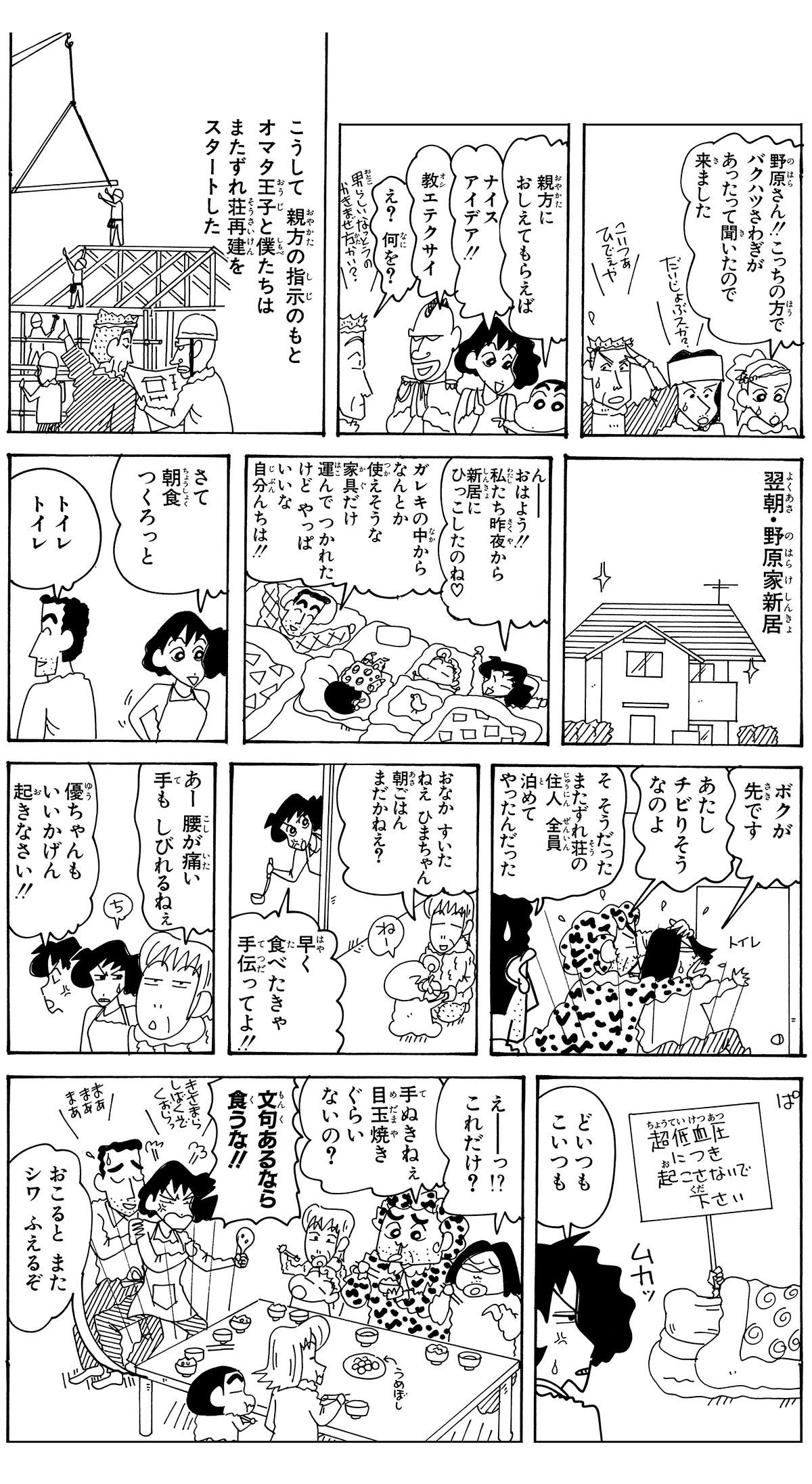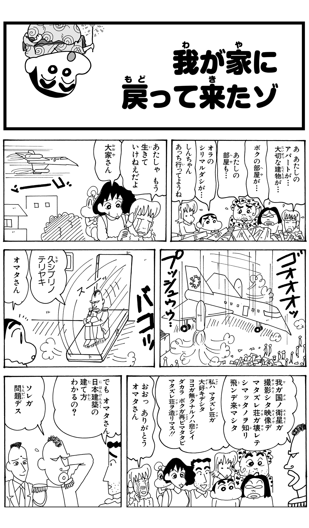 全7話公開中! 549 我が家に戻って来たゾ 2026.3.5 臼井儀人 ポスト LINEで送る ■ジュニア版クレヨンしんちゃん オリジナルのコミック『クレヨンしんちゃん』全50巻の中から、お子さまにも読みやすいお話をセレクトした再編版! 本記事は「ジュニア版 クレヨンしんちゃん 19」から一部抜粋・編集しました。 野原一家 しんちゃん ひろし みさえ ひまわり またずれ荘 四郎 大屋 主代 役津栗 優 スーザン小雪 汚田 急痔 にがりや京助 オマタ ■ジュニア版クレヨンしんちゃん ■【画像】どうされました?診察するしんちゃん■ ジュニア版クレヨンしんちゃん我が家に戻って来たゾ このお話の単行本を購入 電子コミックストアで購入 原作: 臼井儀人 87年に『だらくやストア物語』が双葉社「週刊漫画アクション」新人賞佳作に入賞しデビュー。90年8月より『クレヨンしんちゃん』を同誌にて連載開始。その他の代表作は『おーえるグミ』『あんBaらんすぞ~ん』『すくらんぶるえっぐ』など。 「ひろし」の商品を見る