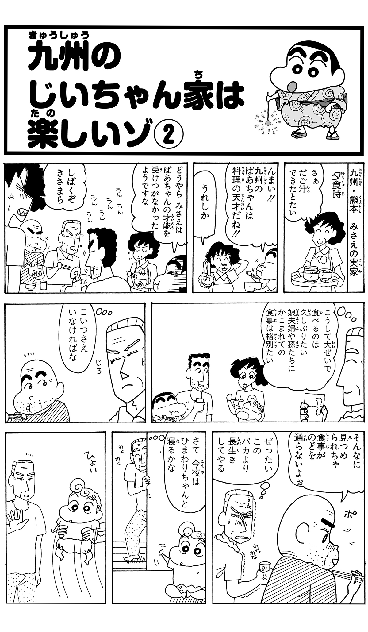 全7話公開中! 564 九州のじいちゃん家は楽しいゾ その2 2026.3.20 臼井儀人 ポスト LINEで送る ■ジュニア版クレヨンしんちゃん オリジナルのコミック『クレヨンしんちゃん』全50巻の中から、お子さまにも読みやすいお話をセレクトした再編版! 本記事は「ジュニア版 クレヨンしんちゃん 19」から一部抜粋・編集しました。 野原一家 しんちゃん ひろし みさえ ひまわり 銀の介 よし治 ひさえ ■ジュニア版クレヨンしんちゃん ■【画像】くっつきすぎだゾ!飛び跳ねるしんちゃん■ ジュニア版クレヨンしんちゃん九州のじいちゃん家は楽しいゾ その2 このお話の単行本を購入 電子コミックストアで購入 原作: 臼井儀人 87年に『だらくやストア物語』が双葉社「週刊漫画アクション」新人賞佳作に入賞しデビュー。90年8月より『クレヨンしんちゃん』を同誌にて連載開始。その他の代表作は『おーえるグミ』『あんBaらんすぞ~ん』『すくらんぶるえっぐ』など。 「ひまわり」の商品を見る