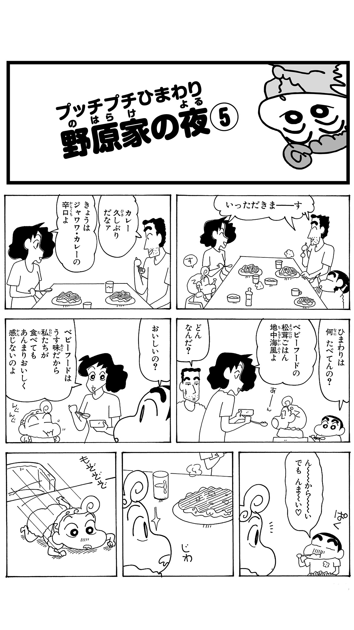 全7話公開中! 574 プッチプチひまわり 野原家の夜 その5 2026.3.30 臼井儀人 ポスト LINEで送る ■ジュニア版クレヨンしんちゃん オリジナルのコミック『クレヨンしんちゃん』全50巻の中から、お子さまにも読みやすいお話をセレクトした再編版! 本記事は「ジュニア版 クレヨンしんちゃん 19」から一部抜粋・編集しました。 野原一家 しんちゃん ひろし みさえ ひまわり ■ジュニア版クレヨンしんちゃん ■【画像】危ないゾ!焦るシロ■ ジュニア版クレヨンしんちゃんプッチプチひまわり 野原家の夜 その5 このお話の単行本を購入 電子コミックストアで購入 原作: 臼井儀人 87年に『だらくやストア物語』が双葉社「週刊漫画アクション」新人賞佳作に入賞しデビュー。90年8月より『クレヨンしんちゃん』を同誌にて連載開始。その他の代表作は『おーえるグミ』『あんBaらんすぞ~ん』『すくらんぶるえっぐ』など。 「しんちゃん」の商品を見る
